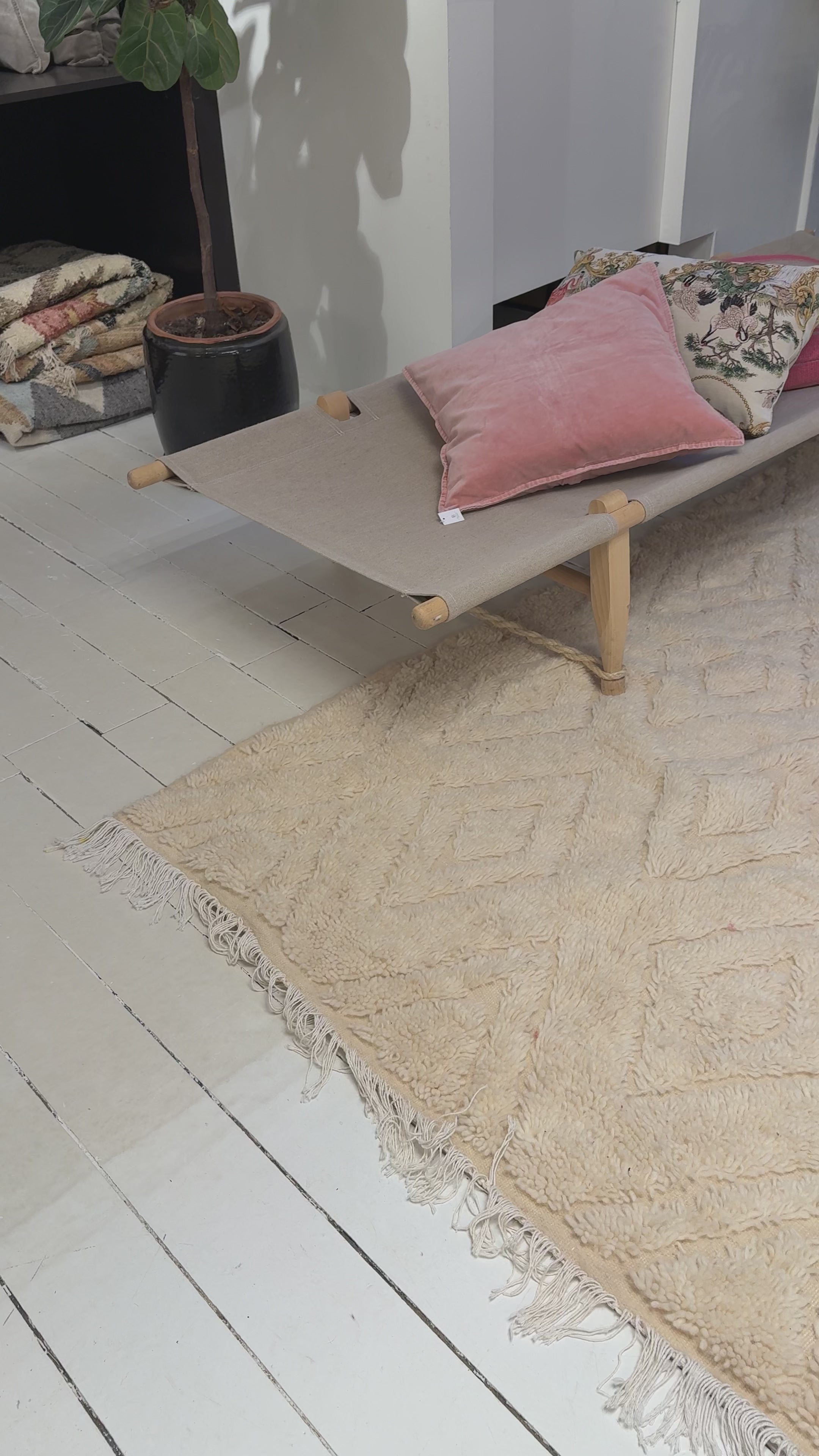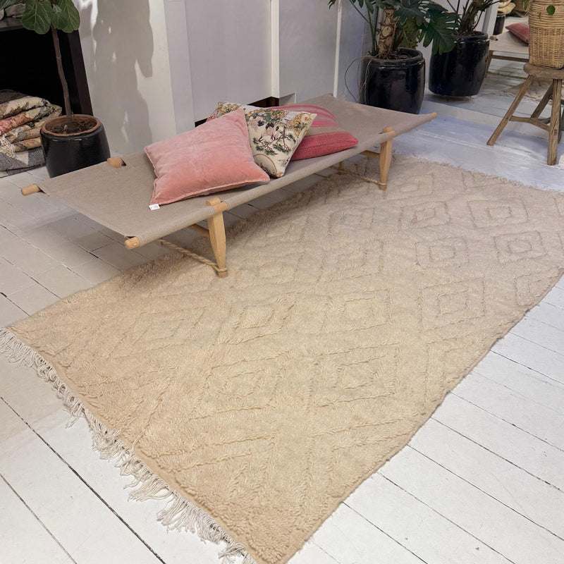 Unika marokkansk gulvtæppe, håndvævet i uld. Vær opmærksom på at dette tæppe er nyproduceret, men for at det skal have et vintage look har håndværkeren afbleget det efter vævning. Dette gør at der er en smule overskudsfarve ud over tæppet. Dette er blot en del af charmen ved køb af marokkanske gulvtæpper.