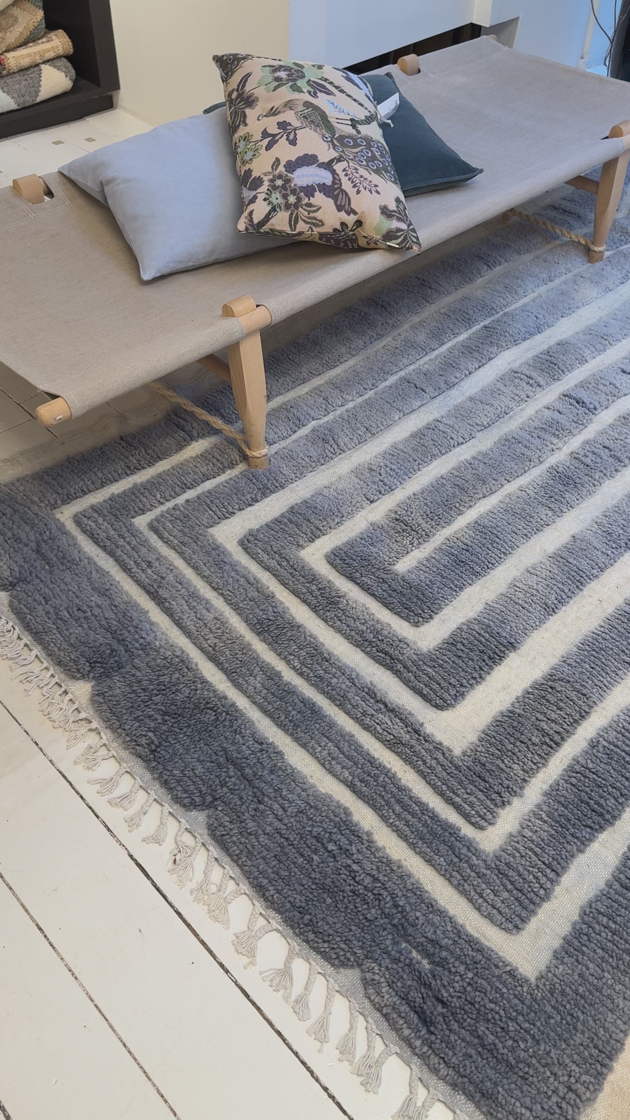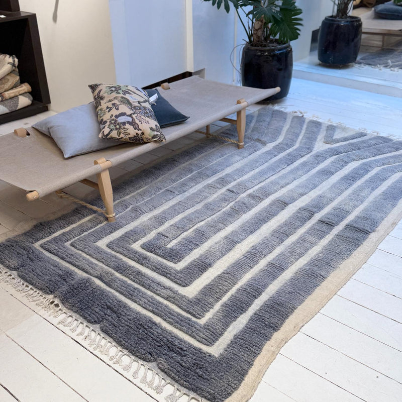 Unika marokkansk gulvtæppe, håndvævet i uld. Vær opmærksom på at dette tæppe er nyproduceret, men for at det skal have et vintage look har håndværkeren afbleget det efter vævning. Dette gør at der er en smule overskudsfarve ud over tæppet. Dette er blot en del af charmen ved køb af marokkanske gulvtæpper.