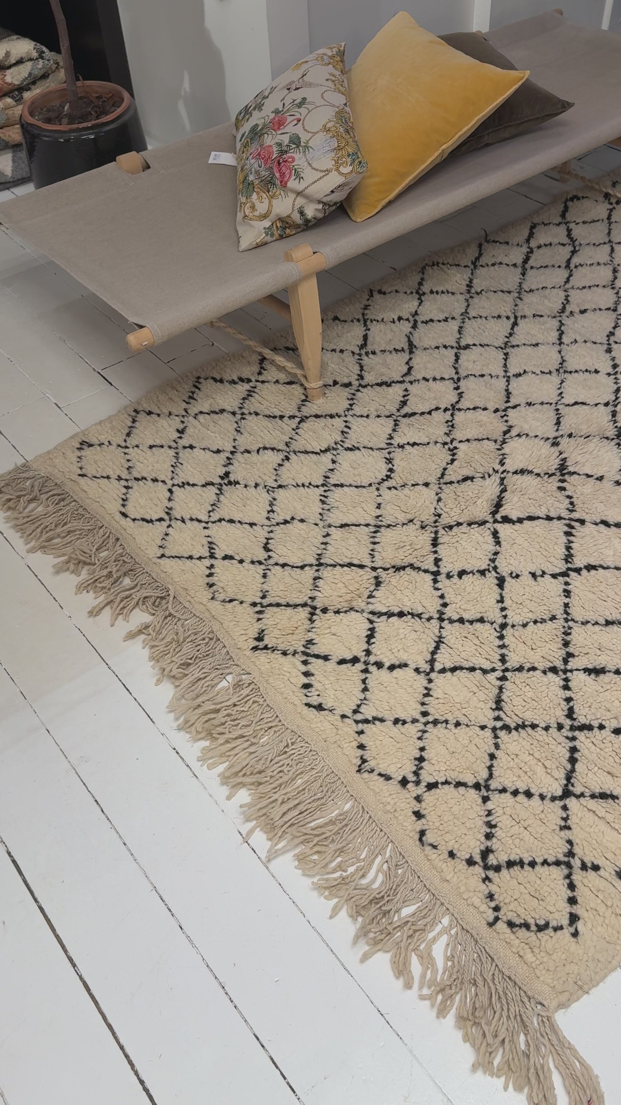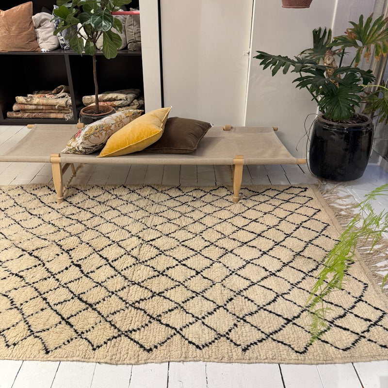 Unika marokkansk gulvtæppe, håndvævet i uld. Vær opmærksom på at dette tæppe er nyproduceret, men for at det skal have et vintage look har håndværkeren afbleget det efter vævning. Dette gør at der er en smule overskudsfarve ud over tæppet. Dette er blot en del af charmen ved køb af marokkanske gulvtæpper.