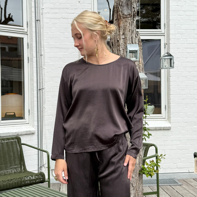 MAVILSB blusen er en rundhalset bluse i silke med lange ærmer. Den falder superfint med løse ærmer, der stadig er smalle. Brug den evt. til SOUVIT bukserne for et fint sæt som på billederne, eller til et par bukser hjemme fra skabet af for et mere hverdagslook.