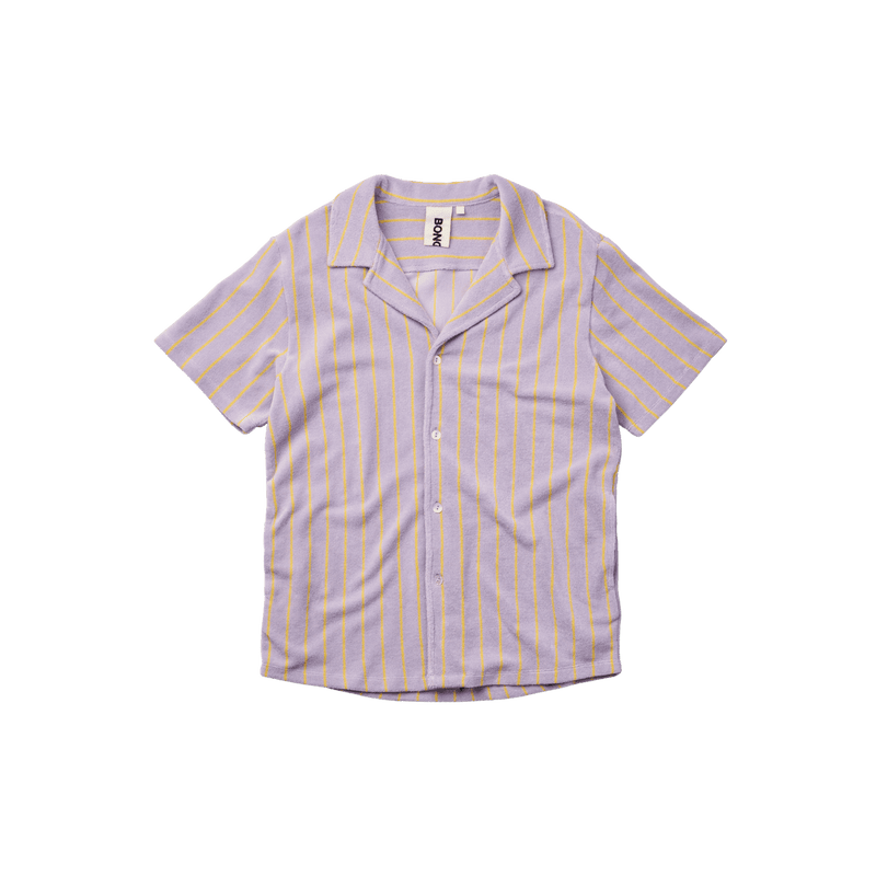 Naram skjorten har en cubansk krave, korte ærmer og fine perlemorsknapper og fås i Bongustas signaturfarver og tidløse striber.