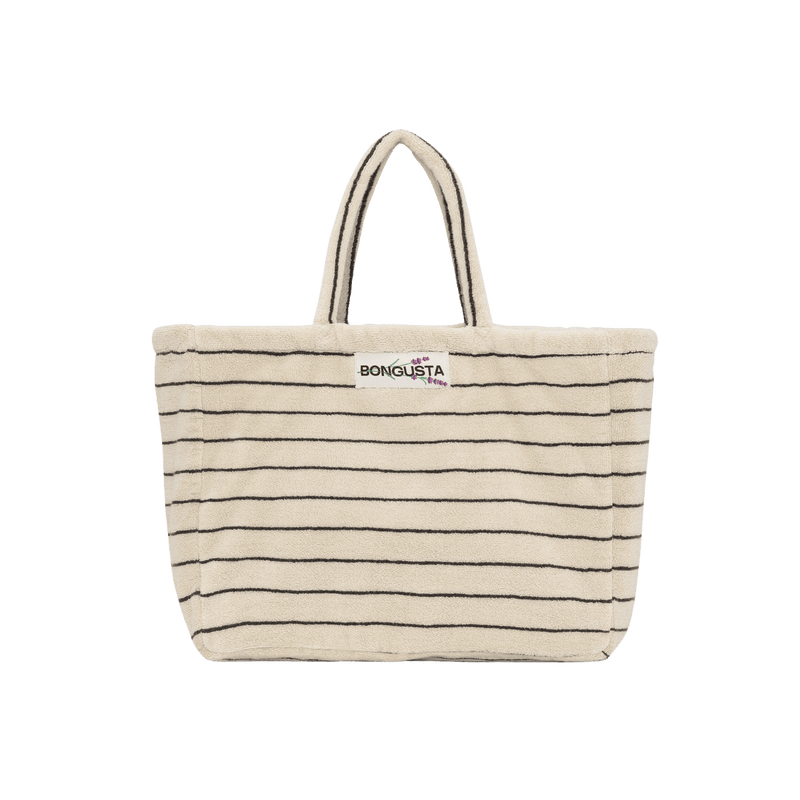Den stribede taske fra Bongusta er lavet i blødt frotté håndklædestof, som består af 100% bomuld. Tasken et smukt broderet Bongusta-label på den øverste del som med taskens frottede tekstur giver dig en anderledes og cool weekendtaske.