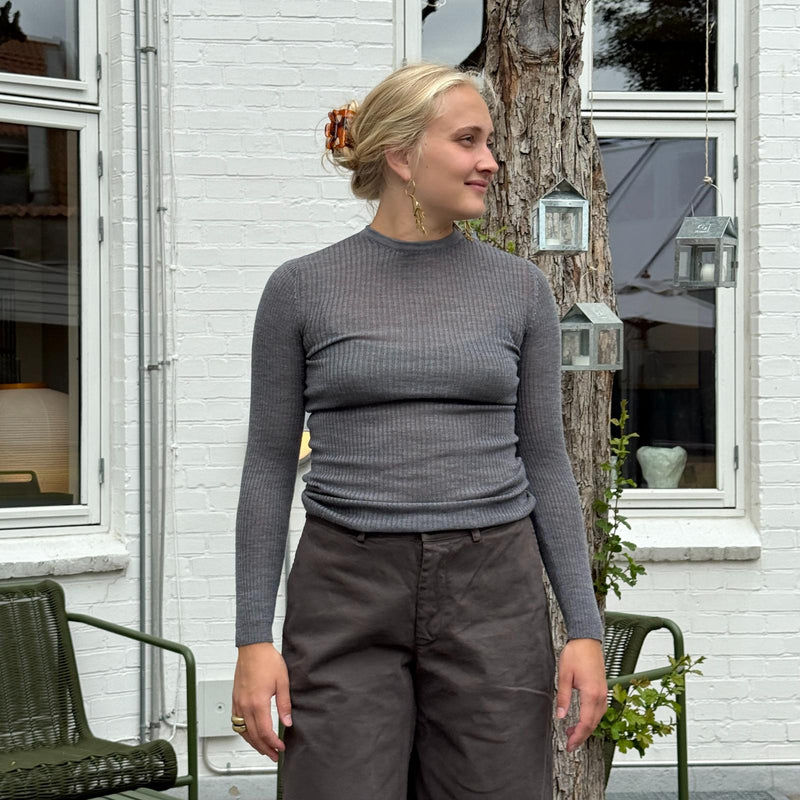 NESI blusen er en langærmet bluse i ribmønster og med en rund hals. En lækker blanding af 75% uld og 25% silke, som gør den dejlig blød.