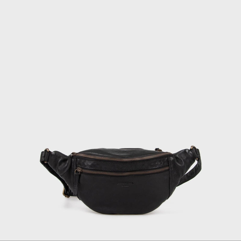 Denne sorte bumbag er en klassisk hverdags bæltetaske fra MONTANA med en justerbar skulderrem og YKK lynlås lukning. Tasken har YKK lynlås lomme på bagsiden, YKK lynlås lomme på front, en indvendig åben lomme, en indvendig lynlås lomme og tre indvendige åbne lommer til kreditkort.