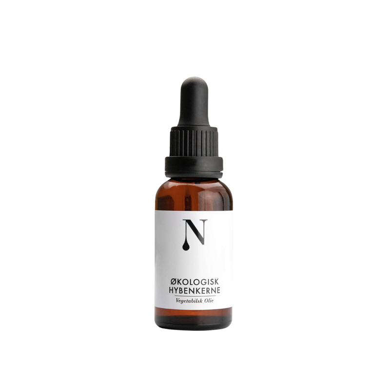 Hybenkerneolie kan anvendes alene eller sammen med andre olier. Påfør den på fugtmættet hud og massér den nænsomt rundt i ansigtet. Start med 5-6 dråber – husk du altid kan tilpasse mængden løbende, hvis du føler, din hud har brug for mere eller mindre olie.