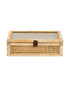 Denne smukke boks er håndlavet i rattan og pileflet og har et elegant glaslåg, der giver et fint kig ind til det du vælger at lægge i. Den naturlige farve og det organiske materiale tilfører varme og personlighed til indretningen, uanset om du bruger æsken på badeværelset, i entreen eller på kontoret. Den lille lukkemekanisme i mørkt metal fuldender det charmerende og funktionelle udtryk.