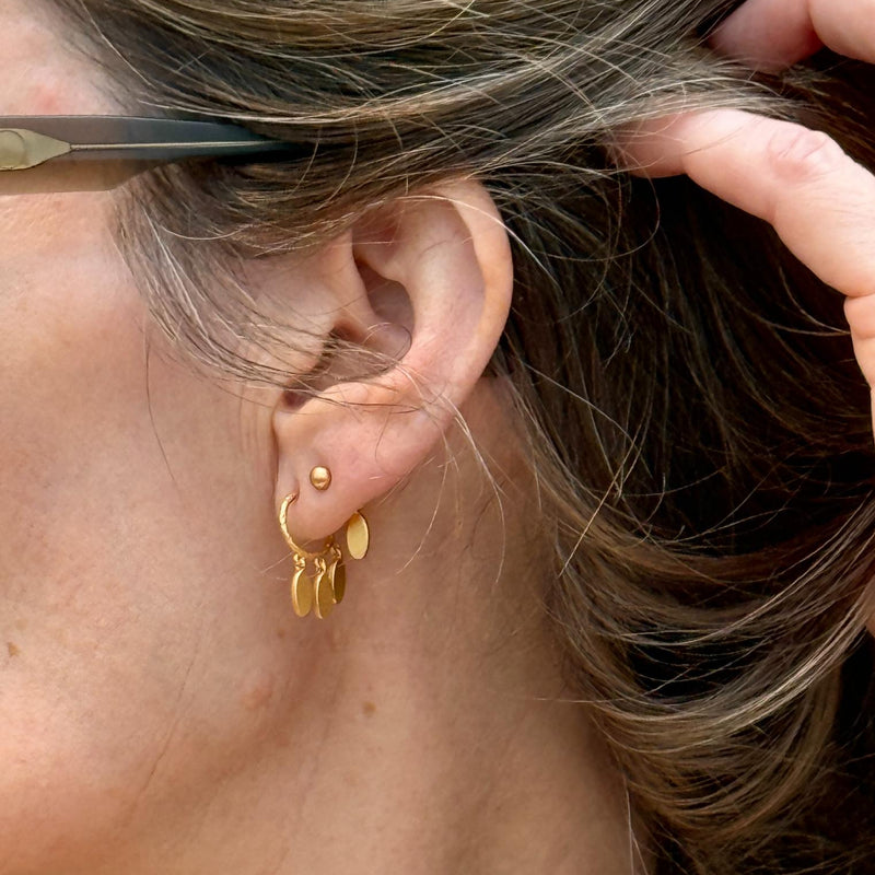 1-Oval ørestikker er belagt med 18K mat guld. Selve låsen til ørestikkerne har et lille ovalformet vedhæng, og pynter fint og diskret bagpå den simple ørestik.