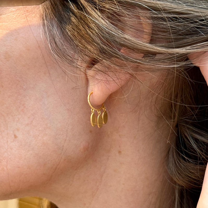 3-Oval øreringene er belagt med 18K mat guld. Øreringene måler ca. 1,2 cm i diameter og har 3 små ovalformede vedhæng.