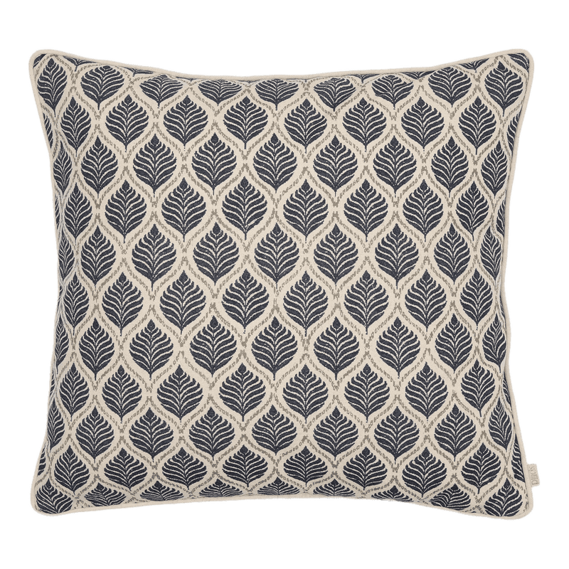 Puden er dekoreret med et raffineret bladmotiv, hvor de fine, detaljerede blade træder smukt frem i en dyb marineblå nuance. Motivet udfolder sig elegant mod en blid cremefarvet baggrund og skaber en harmonisk kontrast med et roligt, sofistikeret udtryk.
