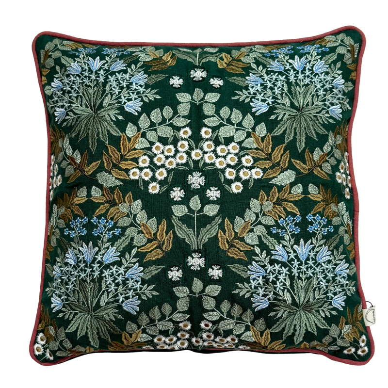 Et lækkert pudebetræk fra Raffinée i de fineste farvekombinationer af grøn, guld, hvid og blå. Bagsiden er grøn. Vend puden op og ned og få et nyt look, når det passer dig.