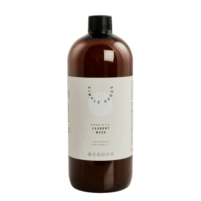 Simple Goods laundry wash, er et koncentreret vaskemiddel der er mild og skån for både tekstiler og miljø. Vaskemidlet er fremstillet af naturlige og økologiske ingredienser og tilsat naturens gode bakterier - probiotika, der rengør tøjet helt ind i fibrene og fjerner dårligt lugt fra både tøj og vaskemaskinen. Tøjet efterlades rent og blødt, med en dejlig duft af lavendel og patchouli.