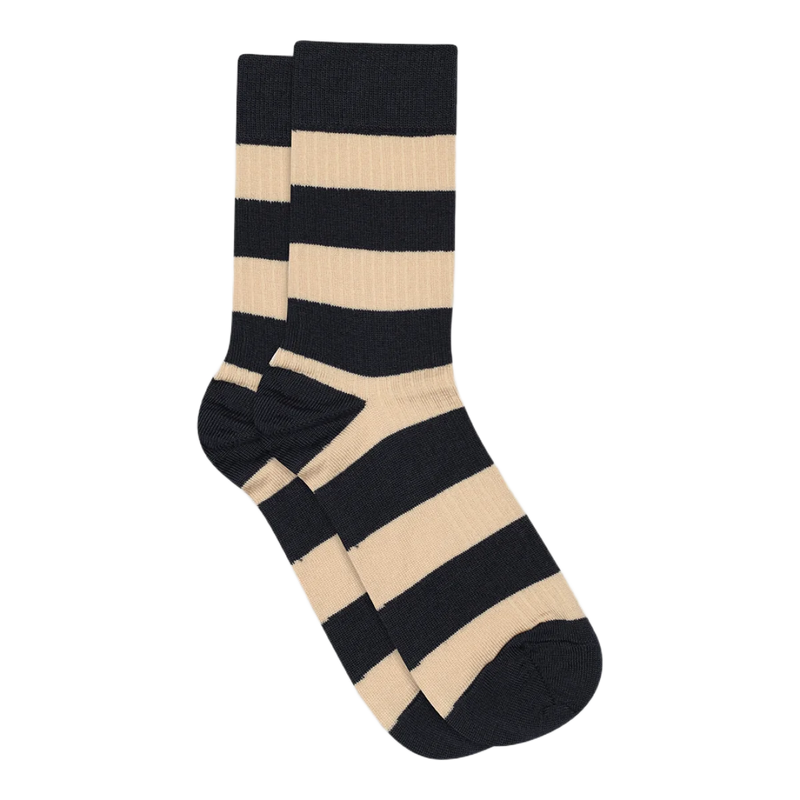 Bløde ribstrømper i merinould fra MPwoman. Strømperne har brede vandrette striber, og en bred ribkant i toppen.