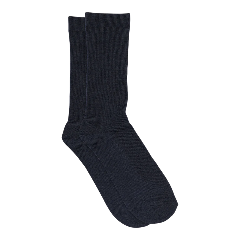 De lækreste mørkeblå tynde og lækre uldstrømper i rib kvalitet. Strømperne er lavet i merinould, som er et naturligt uldprodukt fra Merino-fåret, der er kendt for sine temperaturregulerende egenskaber, der holder fødderne varme selv i vådt vejr og formindsker svedlugt. Merinould er blødere og tyndere end almindeligt uld, hvilket gør det muligt at producere tyndere strømper.