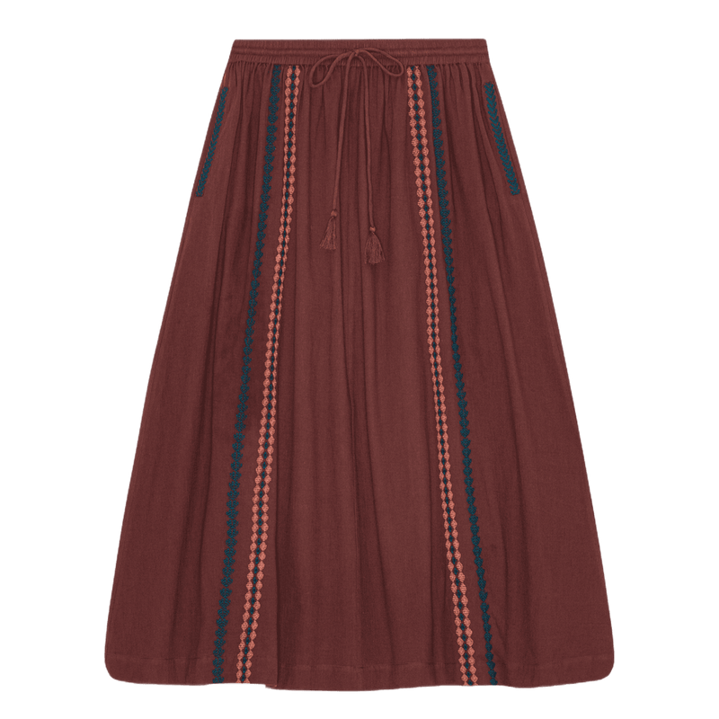 Denne lange nederdel er en fin nederdel med mønstre lavet i økologisk bomuldsstof. Du kan evt. bruge den med Romania Butterfly for at få et fint sæt.
