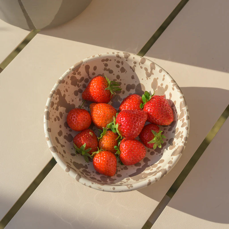 Skålen er lavet i robust keramik i Puglia, Italien og har et smukt sprøjtemalede mønster.