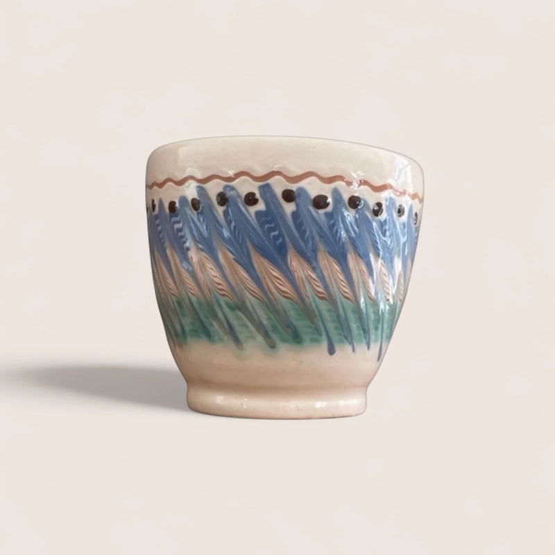 De mange lag maling giver dybde og liv til dekorationerne, og de små sprækker i glasuren er et naturligt tegn på det ægte håndværk. En smuk og levende kop, der bærer historien om en lang tradition videre.