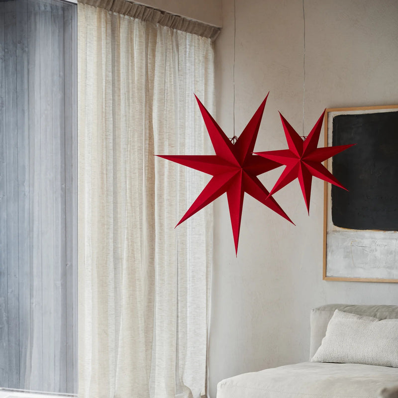 Stjernerne leveres i en kraftig papæske, og kan efter brug nemt pakkes sammen og gemmes væk. Spidserne på stjernerne er lidt sårbare, og kan nemt blive lidt klemte under fragt, så når du pakker din stjerne ud, så brug lidt tid på at rette spidserne lidt op. Når først den hænger, er den smuk uanset om spidserne har fået et lille klem.