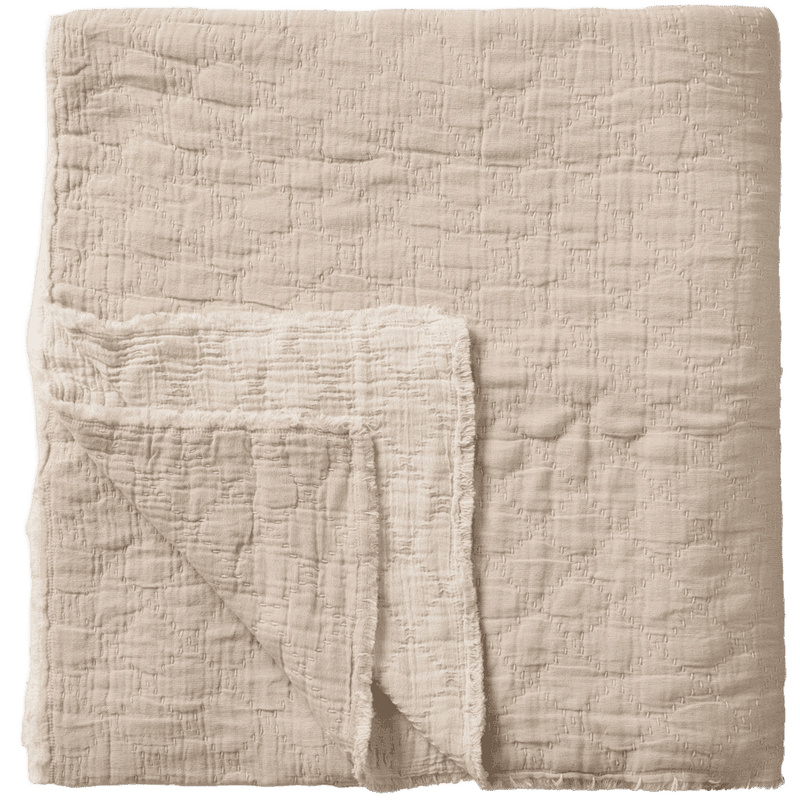 Blødt sengetæppe i dobbeltvævet bomuld med let vatteret struktur og diskret ternet stikning. De afdæmpede farver skaber et roligt, tidløst udtryk.