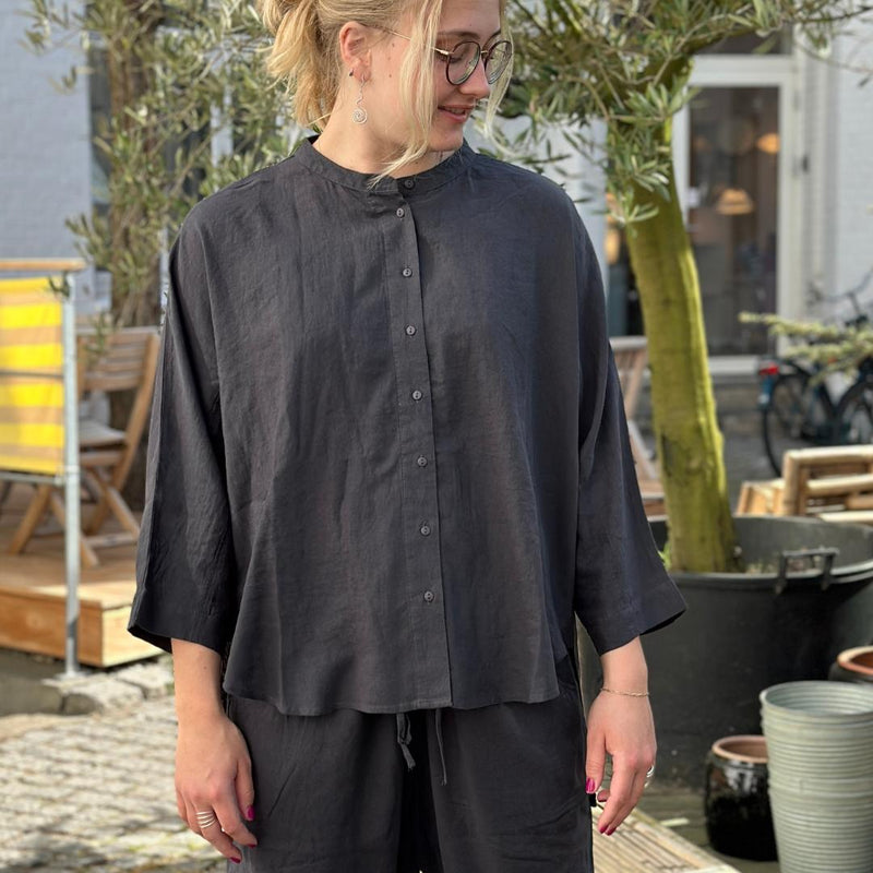 Seoul skjorten fra Frau har et enkelt design med 3/4 ærmer og kinakrave. Skjorten er gennemknappet, er lidt længere bagpå og runder fint foran. Modellen er onesize, som gør den vil sidde forskelligt fra person til person, men passer størrelser fra 34-44.