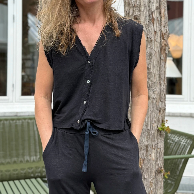 SELER er en cardigan uden ærmer/en vest i 100% hør. Vesten har v-udskæring og knapper hele vejen ned. Trøjen har et råt look, med flossede kanter. Brug den alene som en top eller med en t-shirt eller bluse indenunder.