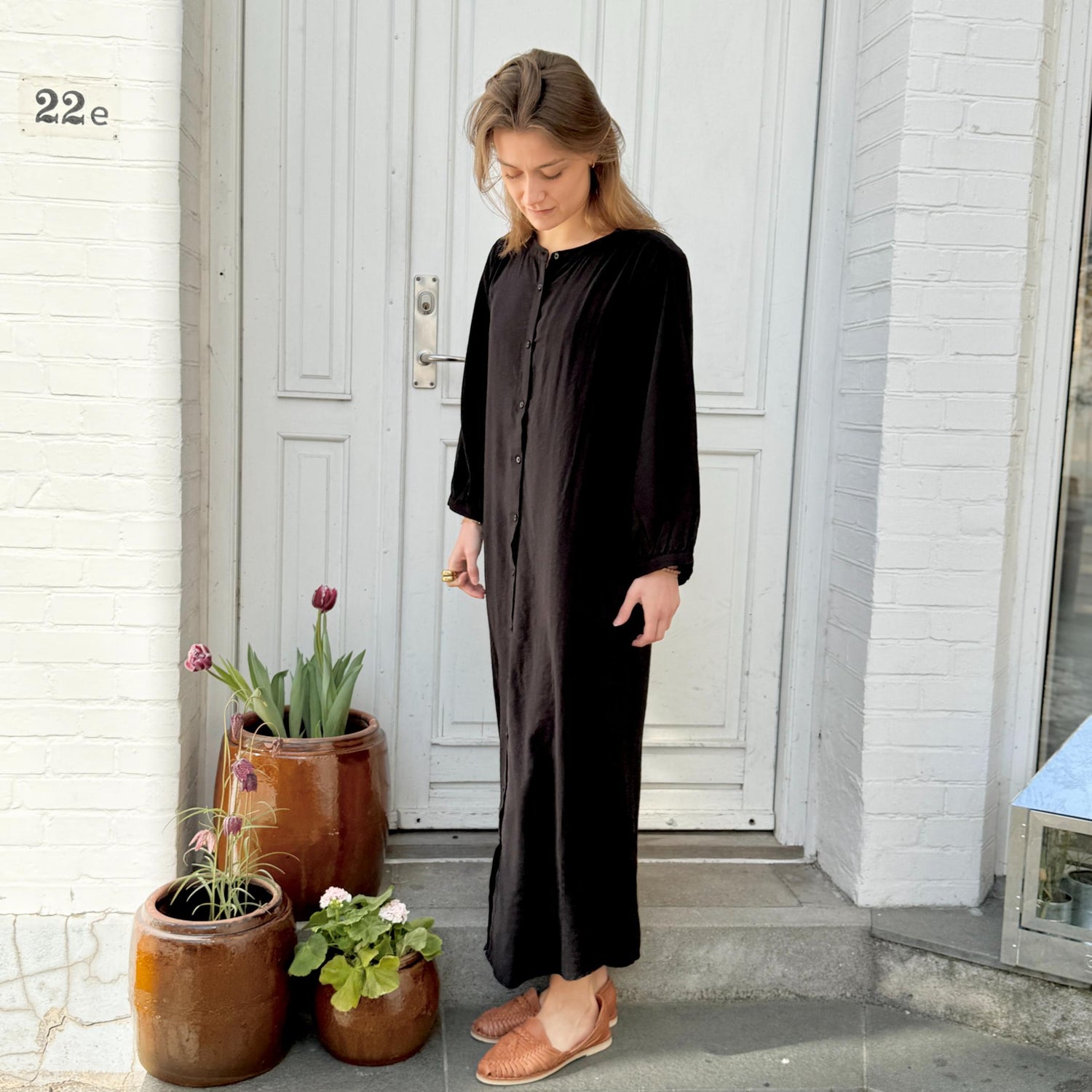 Bari kjolen fås både i en smal og bred version - dette er den smalle. Kjolen er lang, gennemknappet og har kinakrave samt et aftageligt bælte. Kjolen har rynke detalje foran på skulderskæringen og to sidelommer.