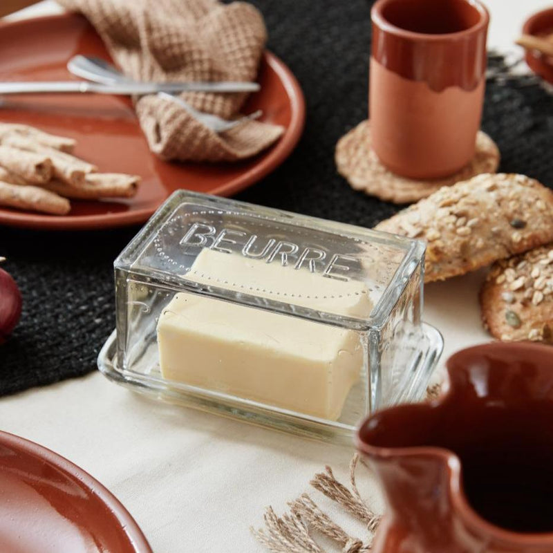 En sød klassisk smørboks i glas, hvor der står Beurre på toppen af lågen.