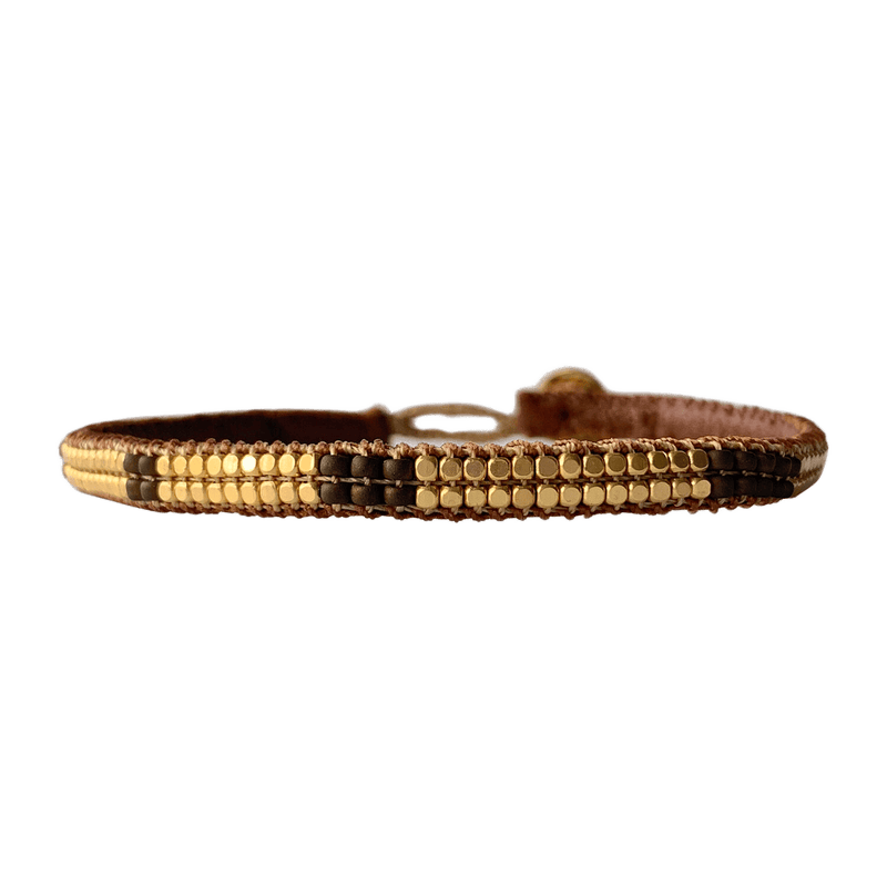 Tate armbåndet fra IBU Jewels er et fint perlearmbånd med guldfarvet perler som base, hvor der er små farvet perler blandet ind mellem. Det danner sammen et fint mønster. Armbåndet er lavet af eksklusive Miyuki-perler, som er håndsyet på blødt læder.