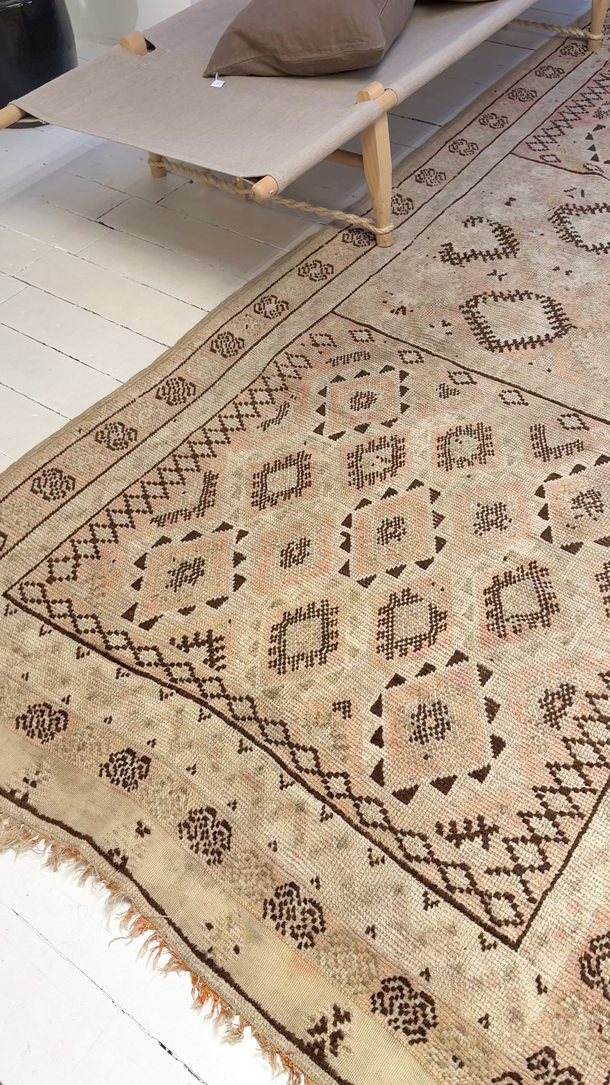 Vores vintage marokkanske gulvtæpper er unikke stykker håndværk, vævet i uld og båret af mange års liv og brug. Hvert tæppe har sin egen historie, sine egne spor og sine egne særlige detaljer – fra traditionelle symboler til små reparationer udført af de hænder, der har brugt dem gennem tiden.