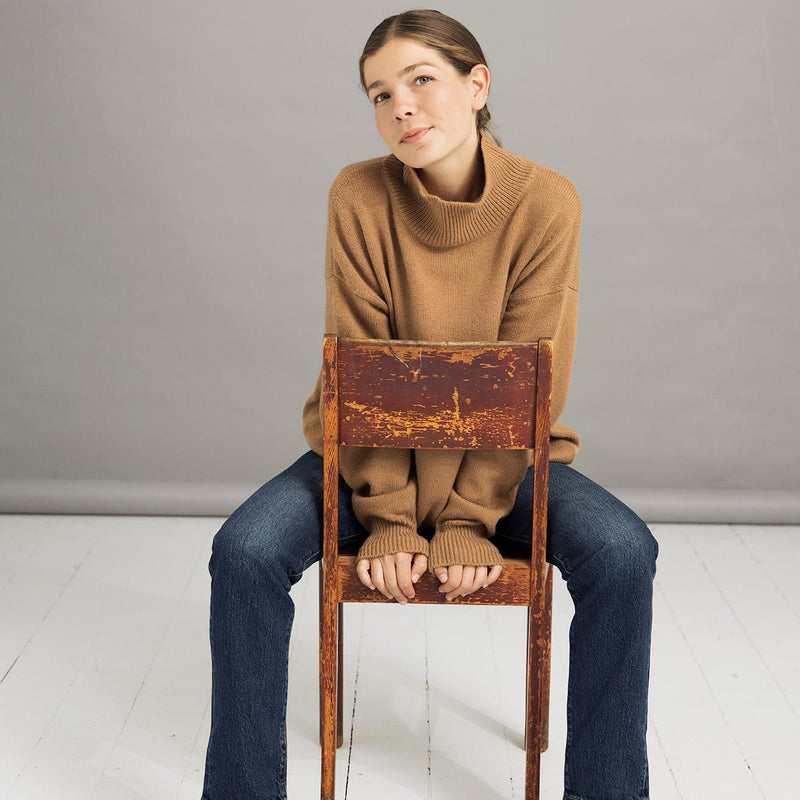 Den her striktrøje er en blød chunky sweater med en høj hals og ribkant i ærmer og bund. Perfekt til de kolde vintermåneder, hvor man har lyst til at blive omfavnet af blødhed. Kombinationen er 90% merinould og 10% kashmir, hvilket giver det blødeste mix!