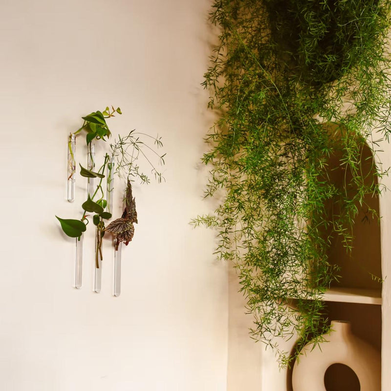 Walleaf er en elegant, væghængt glasvase designet til stiklinger, små blomster og friske krydderurter. Med sit enkle og lette udtryk er den perfekt til at give liv til bare vægge og små hjørner i hjemmet – uden at optage plads.